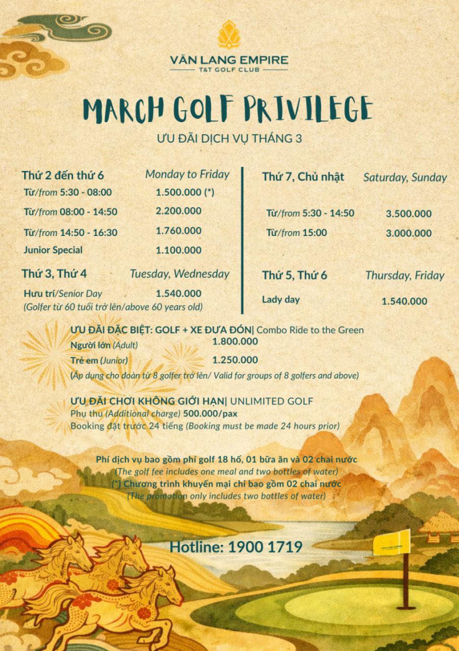 Mang đến những ưu đãi tuyệt vời dành cho khách hàng đến trải nghiệm Văn Lang Empire T&T Golf Club với những hố golf đầy thử thách giữa thiên nhiên hoang sơ của vùng đất lịch sử & truyền thuyết.